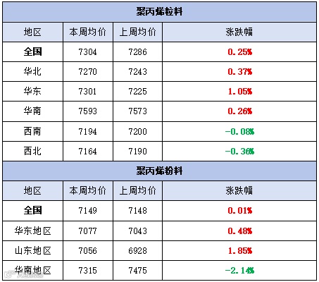 本周聚丙烯市场震荡上行,价格小幅上涨。粉料全国均价为7304元/吨,较上周均价上涨18元/吨,涨幅为0.25%。粒料全国均价为7149元/吨,较上周均价上涨1元/吨,涨幅为0.01%。
