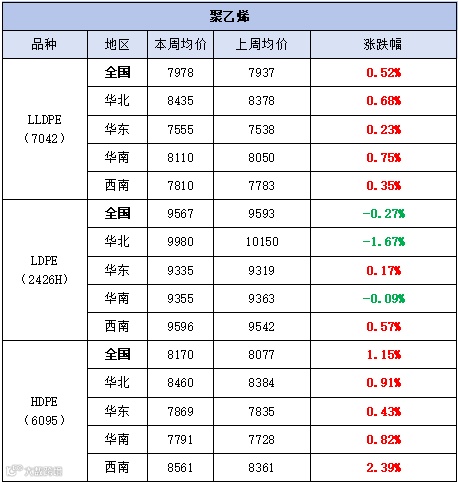 本周聚乙烯市场偏强震荡,价格以涨为主。LLDPE(7042)市场均价为7978元/吨,较上周均价上涨41元/吨,涨幅为0.52%;LDPE(2426H)市场均价为9567元/吨,较上周均价下跌26元/吨,跌幅为0.27%;HDPE(6095)市场均价为8170元/吨,较上周均价上涨93元/吨,涨幅为1.15%。