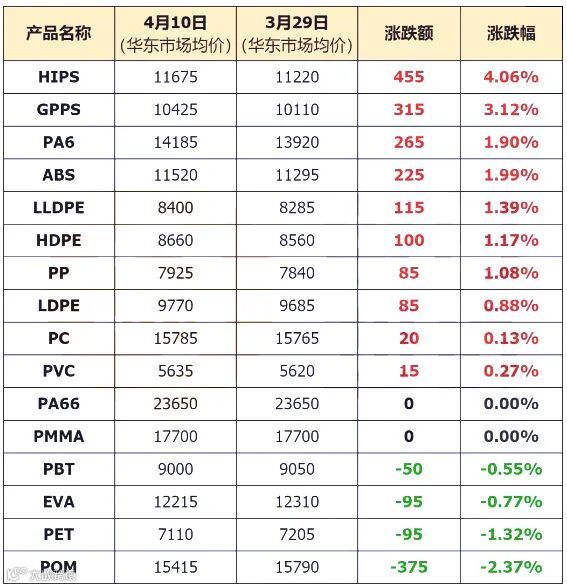 进入4月份,塑市掀起一波炒涨行情。截至4月10日,以华东市场均价计,小编重点监测的16个塑料品类中,有10个品类上涨,占比达62.5%,下跌的品类仅有4个,占比为25%,另有2个品类横盘持稳,占比12.5%。
