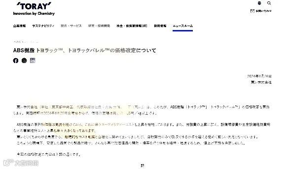 近日,日本东丽公司在其官网宣布,将对旗下ABS树脂产品Toyolac™和Toyolac Parel™进行价格调整,调整幅度为每公斤增加35日元(约合人民币1659元/吨)。