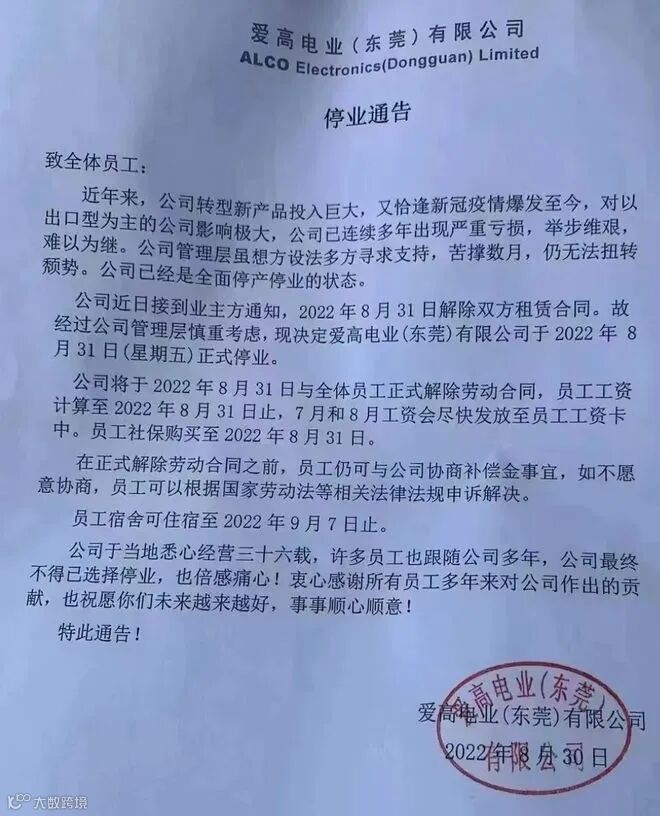 8月30日,经营三十六载的东莞电子老厂爱高电业(东莞)有限公司(以下简称爱高东莞公司)发布停业通告。