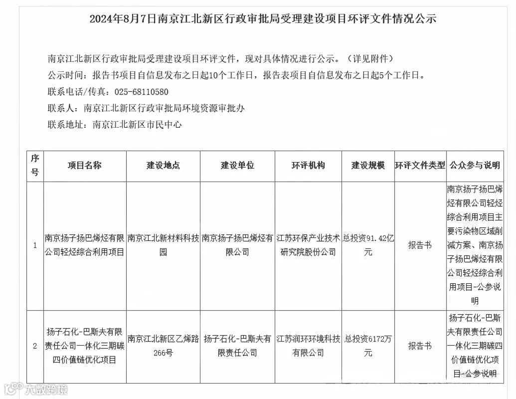 8月7日,南京江北新区行政审批局发布受理南京扬子扬巴烯烃有限公司轻烃综合利用项目和扬子石化-巴斯夫有限责任公司一体化三期碳四价值链优化项目公示: