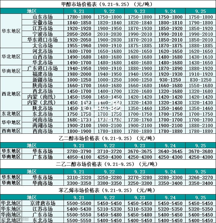 醇类报价(9.21-9.25)
