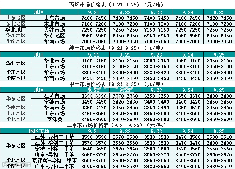烃类报价(9.21-9.25)
