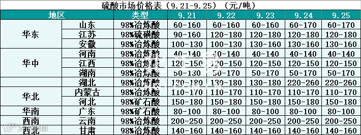 硫酸报价(9.21-9.25)