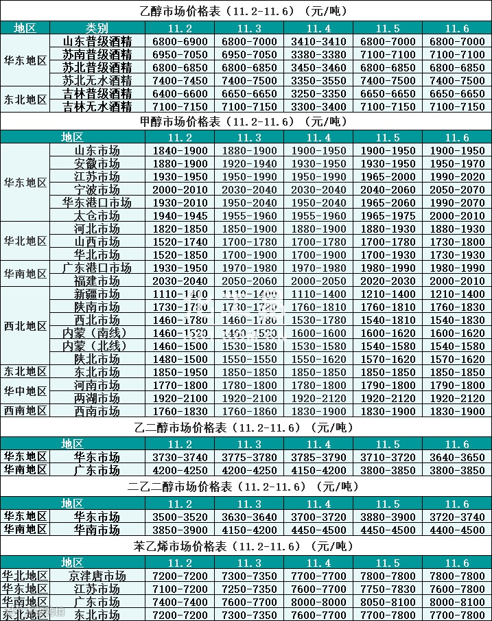 醇类报价(11.02-11.06)