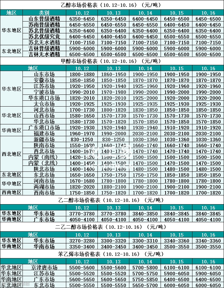 醇类报价(10.12-10.16)