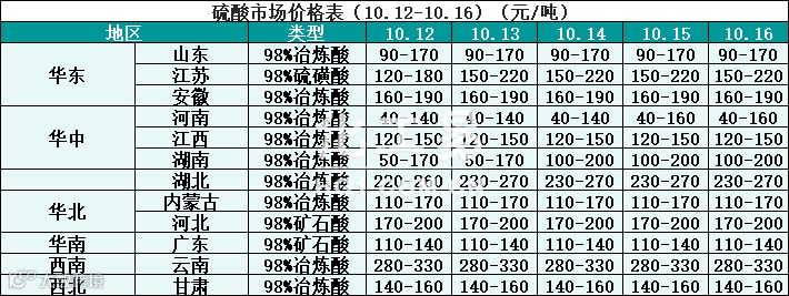 硫酸报价(10.12-10.16)