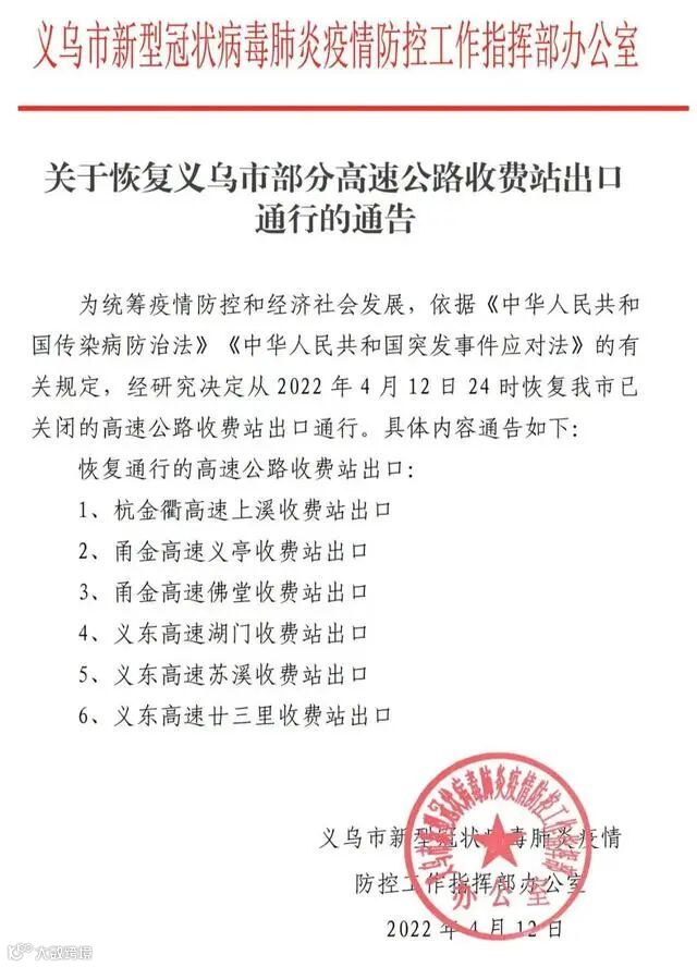 2022年4月10日19时起,恢复威海市境内11处高速公路收费站出入口的通行,具体如下: