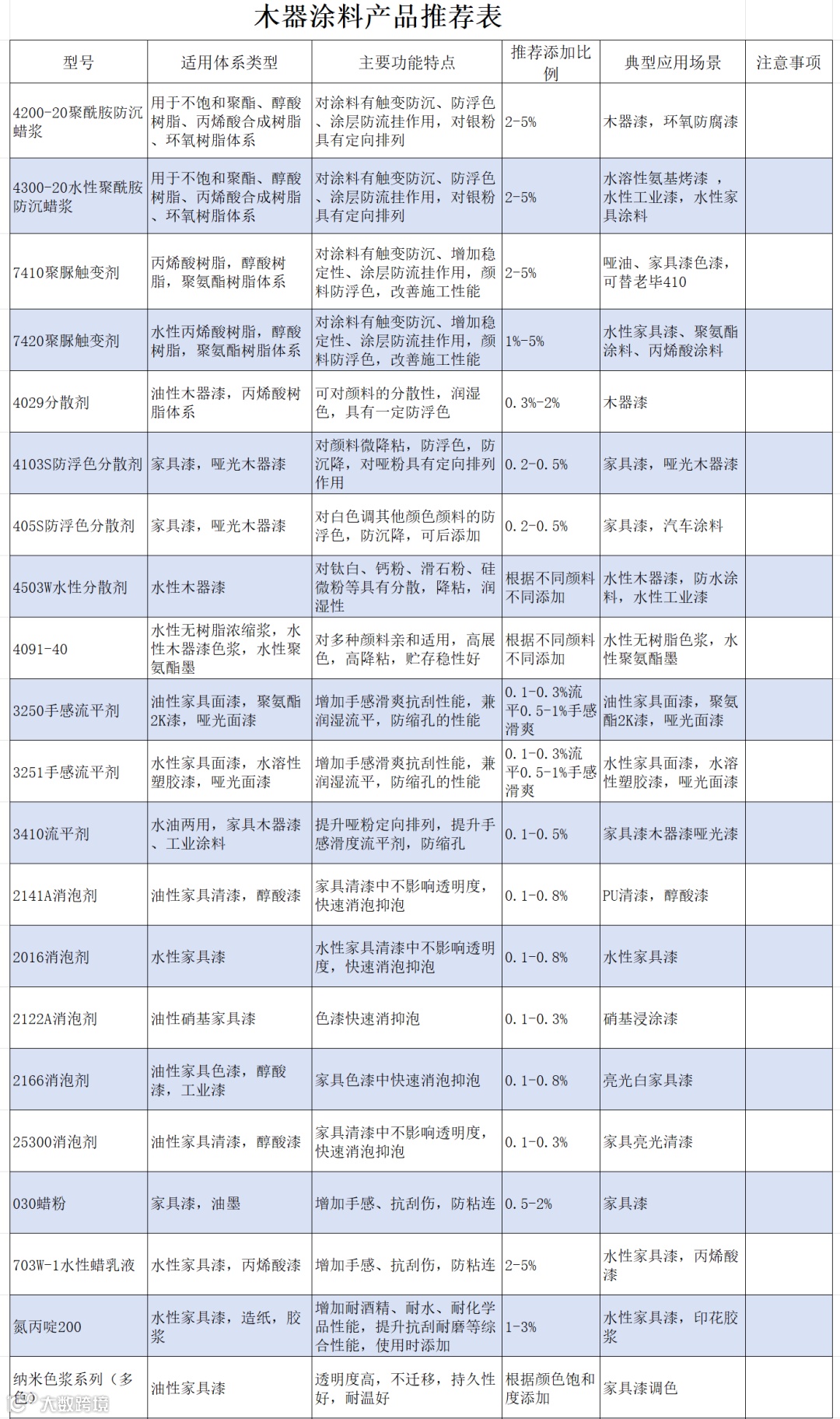 木器漆助剂的选择需结合涂料类型(溶剂型 / 水性、PU/UV/NC)、基材特性(软木 / 硬木、含油脂与否)、施工工艺及最终性能需求(如高光 / 哑光、室内 / 户外)。