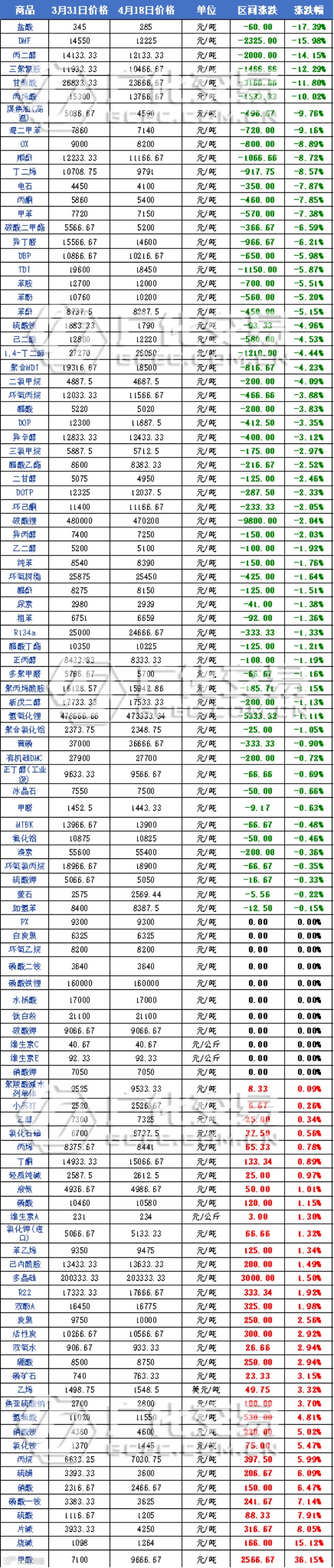 DMF:4月18日报价12225元/吨,区间下行2325元/吨,跌幅15.98%;