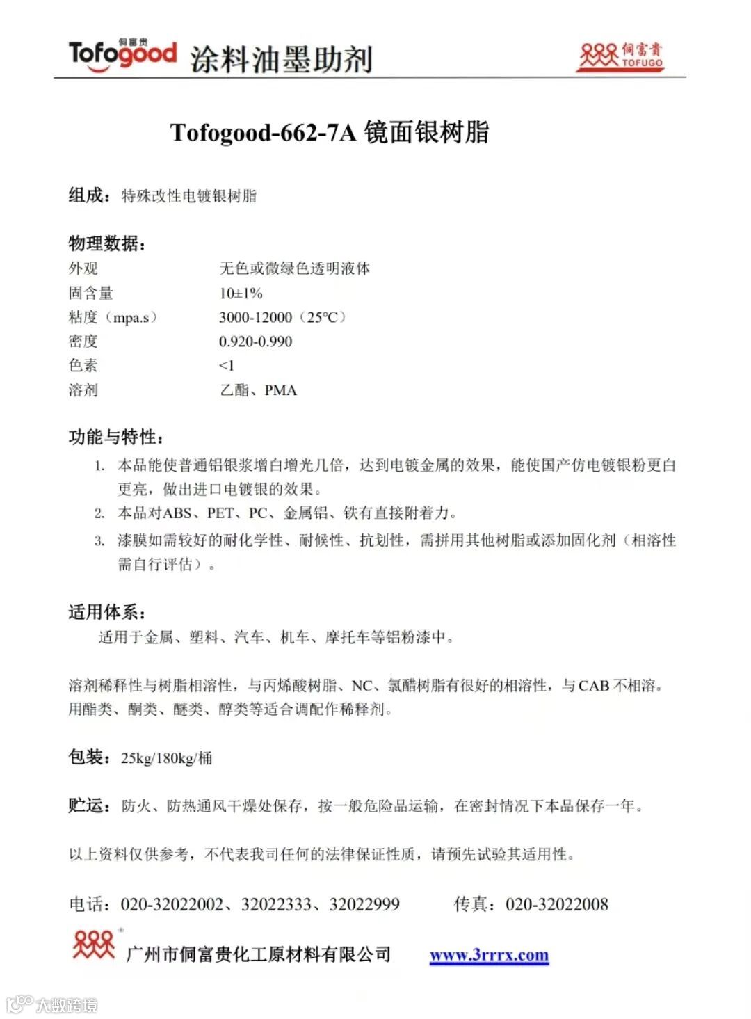 Tofogood-662-7A 镜面银树脂是一款专为铝银粉涂料体系开发的特殊改性电镀银树脂,主要用于提升银粉涂层的亮度与金属质感。产品呈无色或微绿色透明液体