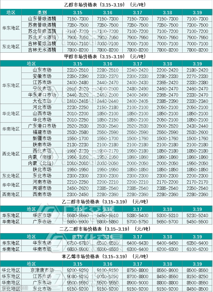 醇类报价(3.15-3.19)