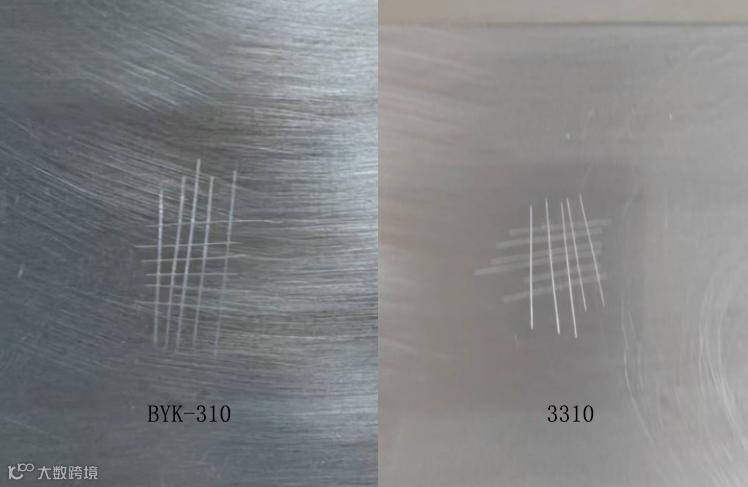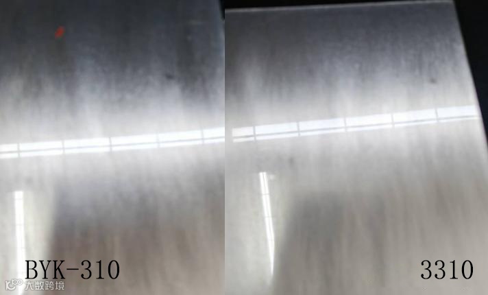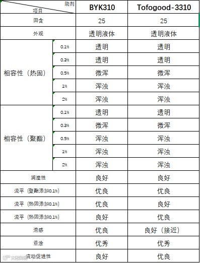 结论:同条件下测试,Tofogood-3310在热固、聚酯体系中滑感稍弱BYK310,流平、润湿性、相容性、重涂等性能与BYK310基本相近,在热固、聚酯烤漆中可完全代替BYK310。
