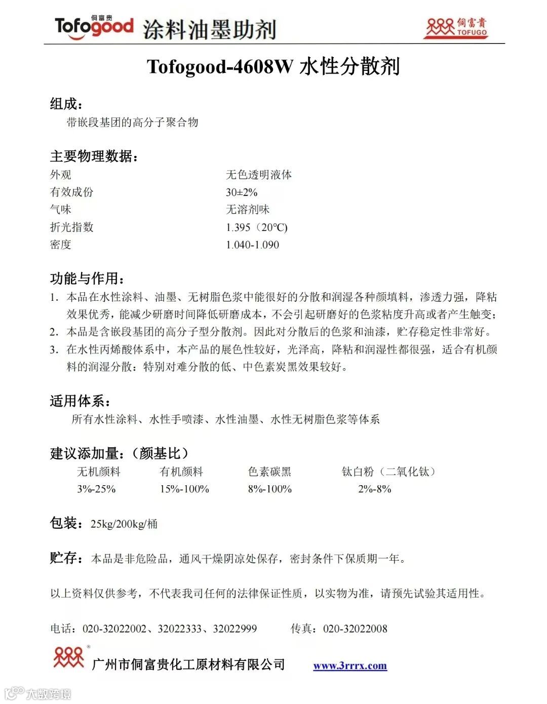 橡胶炭黑能作为黑色颜料提升油墨性能 ,添加后可赋予油墨深沉且稳定的黑色,提升油墨的遮盖力,能赋予水性油墨一定导电性,可用于制备导电水性油墨,适配电子元件印刷等特殊需求场景,可广泛应用于轮胎、水性色浆、高档油漆油墨、等体系,橡胶炭黑本身高度疏水,而水性油墨以水为分散介质,若直接添加易出现团聚、沉淀,会严重影响油墨的均匀性。而常规的色素炭黑分散剂几乎对橡胶炭黑没有作用,为解决这一难题,侗富贵专门研发了针对橡胶炭黑等难分散的无机颜料研发了这款:“Tofogood-4608W”