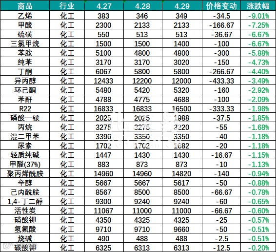 跌幅前3的产品分别为乙烯(-9.01%)、甲酸(-7.25%)、硫磺(-6.67%),国内市场中与石油产业链相关的乙烯、苯胺、纯苯、混二甲苯、丙烷等产品也出现了价格下跌。此前在疫情中受供需影响较大的海外消毒产品异丙醇,也在经历了暴涨之后,跌入低谷,下跌幅度为3.49%。