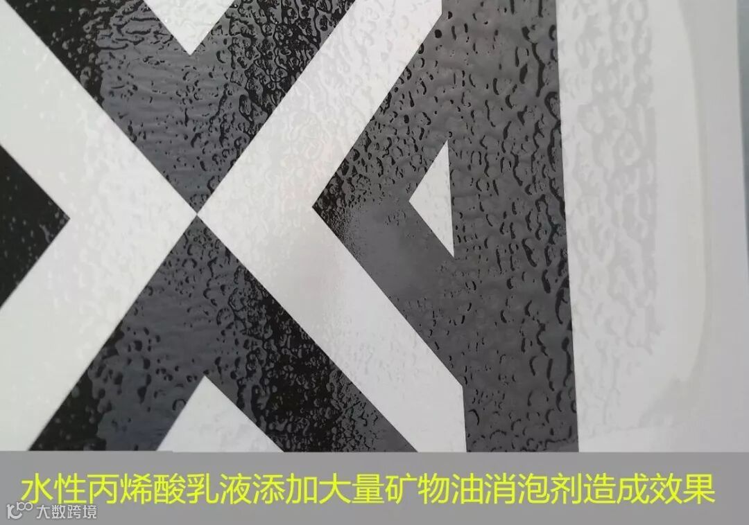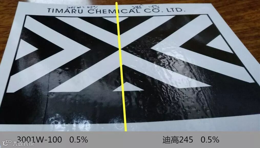 ▲在两个组份的水性丙烯酸乳液中分别加入3001W-100与迪高245各0.5%,刮板后观察,如下图: