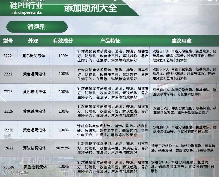 适用于双组份 PU、单组分聚氨酯、氨基烤漆、硝基浸涂、酸固化氨基、环氧等体系。应用实例:硅 PU