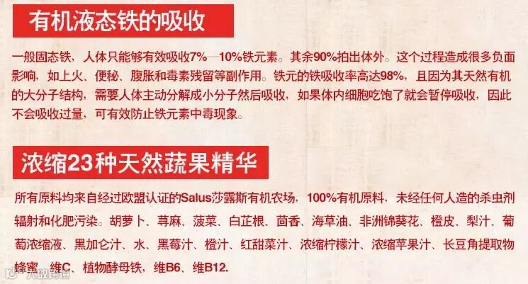 建议:为了保证人体能够完全吸收铁质和植物精华,最好空腹服用,建议餐前30分钟。某些药品和饮料,如茶,咖啡和牛奶等,会影响铁的吸收,所以在服用本品时在一小时内不要饮用茶,咖啡和牛奶。但是,适量饮用橙汁,由于富含维生素C,可以有效帮助人体对铁质的吸收。