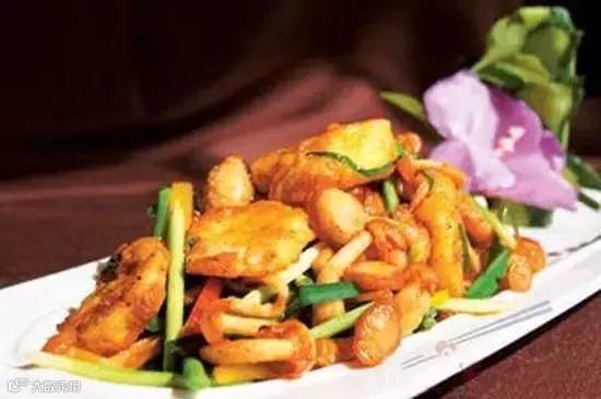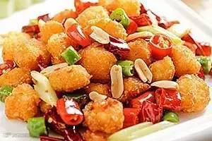 3、锅底留油,先下干辣椒节和花椒炝香,再放少许香辣酱和西芹块翻炒数下,然后下炸好的扇贝和青红椒节,加盐、味精、鸡精、香油、和花椒油炒匀,最后撒入炸酥花生装盘便可上桌。