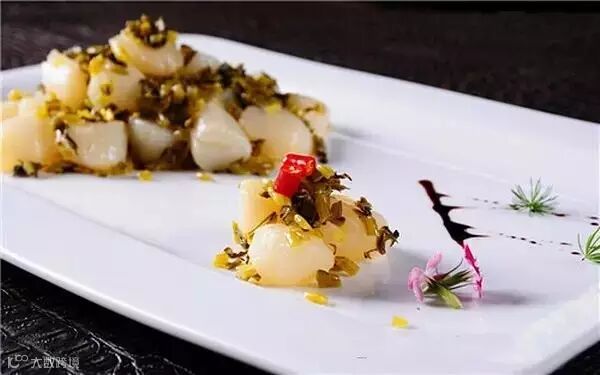 1.芒果贝用海水清洗干净,入70℃-80℃的水中飞水30秒,摆盘。