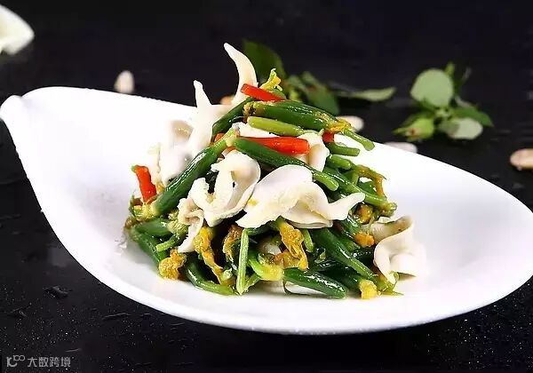 主料:新鲜鸟贝200克,黄瓜花150克,美人椒数根。