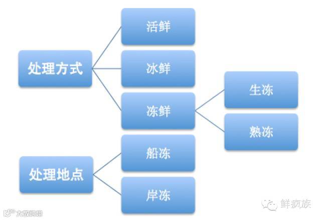 为了保持海鲜食材最新鲜的那一刻,人类在远洋捕捞的过程中摸索出了多种处理方式,以针对不同的情况处理不同品类的海鲜,主要的处理方式有以下三种:活鲜、冰鲜、冻鲜;而根据处理地点也分为船冻和岸冻两种。