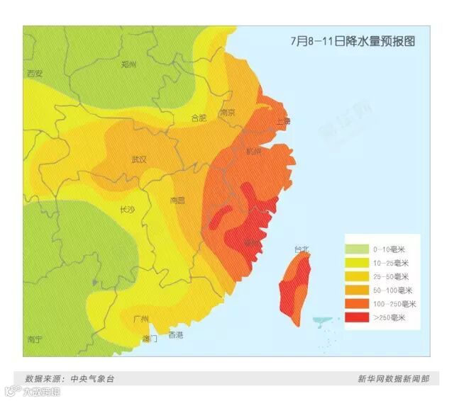 据中央气象台预计,“尼伯特”登陆后将会经华东地区北上,可能影响山东半岛甚至辽东半岛,陆上滞留时间长达60小时。滞留时间越长,影响范围也会越大。预计从7月8日至11日,台湾及闽、浙、赣、苏、沪、皖等7省市将有强降雨天气,一些地区将会出现大暴雨天气,台湾、浙江东南部和福建东北部局地还将有特大暴雨。