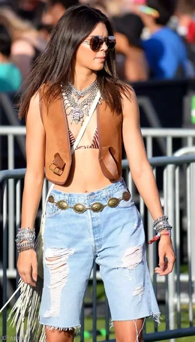 Kendall Jenner在音乐节上则是用流苏和破洞牛仔百慕大短裤演绎了一出波西米亚风情。