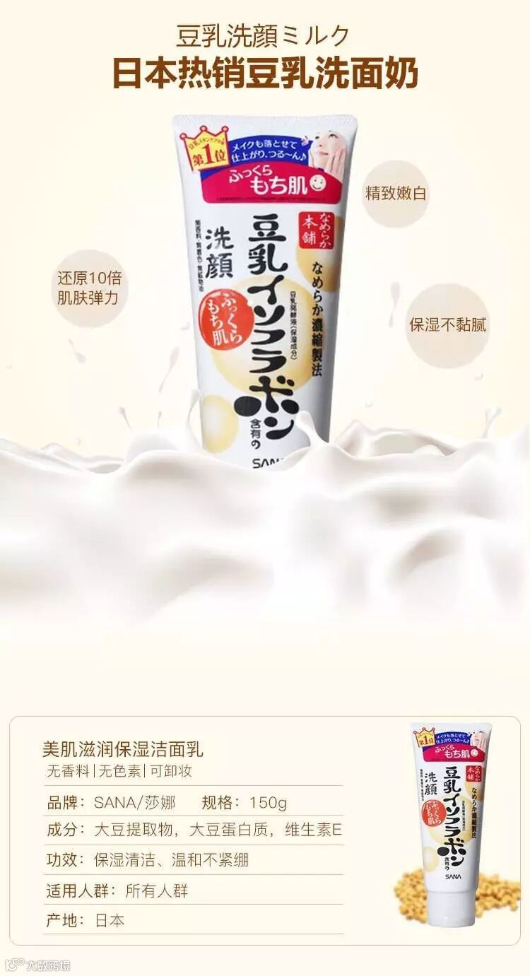 SANA豆乳洗面奶蕴含天然豆乳成份,能制造丰富泡沫,有效清洁皮肤及化妆品残积。滋润保湿锁水,给肌肤最滋润的呵护,防止黑色素的产生,预防和改善斑点和雀斑,防止胶原蛋白的减少,提高肌肤的弹力。