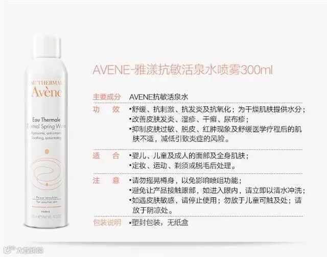 雅漾喷雾具有舒缓、减少刺激特性,确保了它对敏感肌肤的安全性和耐受性,为肌肤带来及时的舒缓呵护。除了将其作为补水喷雾使用,还可以在晒后配合雅漾无菌无纺布面膜进行活泉水湿敷,每日使用15分钟,连续使用7天,进行密集护理。切记不可摇晃,否则压力会失去,无法使用。
