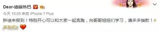 随后,迪丽热巴也转发了该微博:“胖迪来报到!特别开心可以和大家一起奔跑,向哥哥姐姐们学习,请多多指教!”
