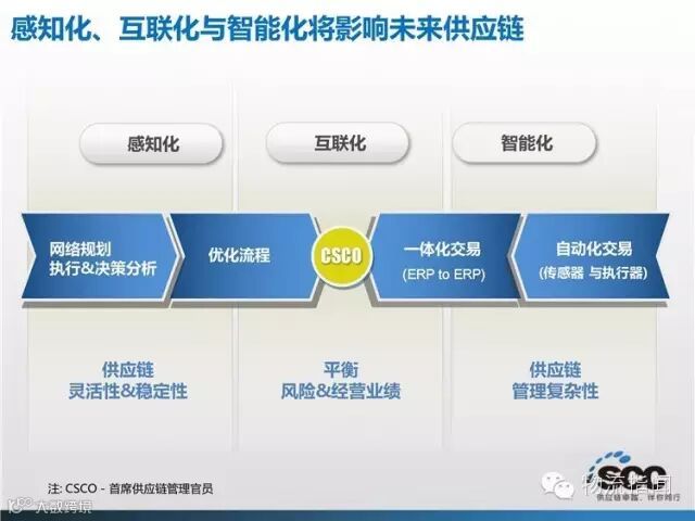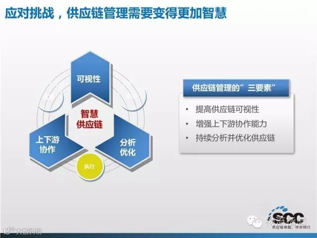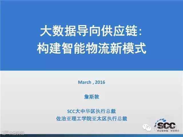 大数据导向供应链——构建智能物流新模式的Slides,是由SCC大中华区执行总裁、佐治亚理工学院亚太区执行总裁詹斯敦先生早些时候给出。内容涉及:➊商业环境和挑战➋供应链未来趋势和走向➌大数据的应用情况➍协同式供应链➎华为协同式供应链管理应用案例。学习,收藏!