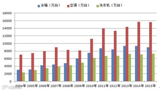 2004-2015年我国主要白色家电产量统计表(万台)
