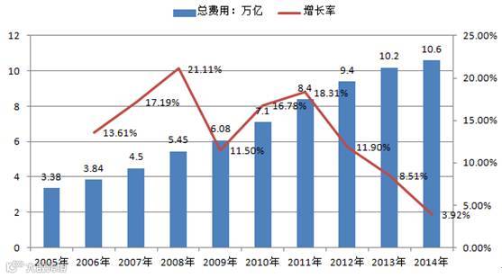 2005-2014年中国社会物流总费用及增长率