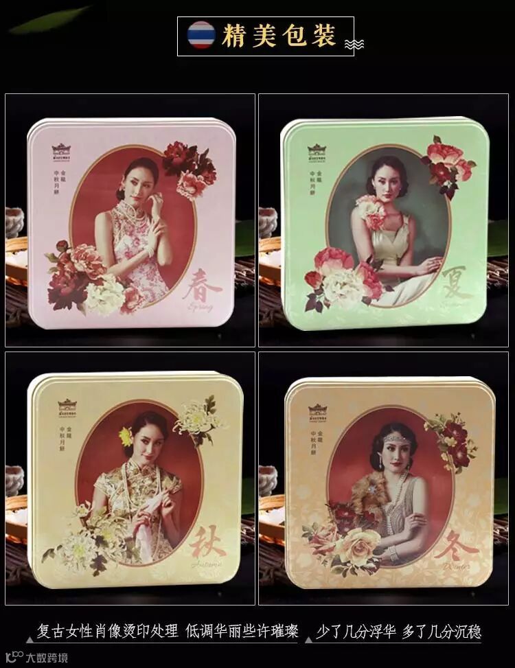 月饼的包装精美而独特,铁盒表面采用复古女性肖像烫印处理,低调而华丽,少了几分浮华,多了几分沉稳。不管是自己享用,还是赠送亲朋好友,都十分适合。