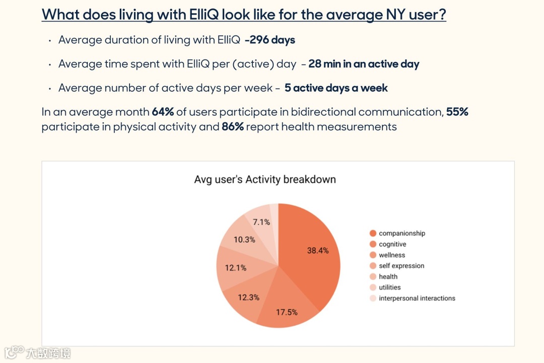 2023年,纽约州老年人家庭服务协会(NYSOFA)发布了一份报告,显示使用该平台的老年人的孤独感降低了95%,幸福感也得到了显著改善。纽约州各地的ElliQ用户也表现出持续的高参与度,每周6天,每天与ElliQ互动超过30次。其中超过75%的互动与改善老年人的社交、身心健康有关。