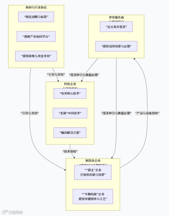 建立“老龄科技产业生态园”: 物理或虚拟集聚芯片、传感器、AI算法、机器人、保健品、养老服务等上下游企业,促进协同创新,降低交易与协作成本。