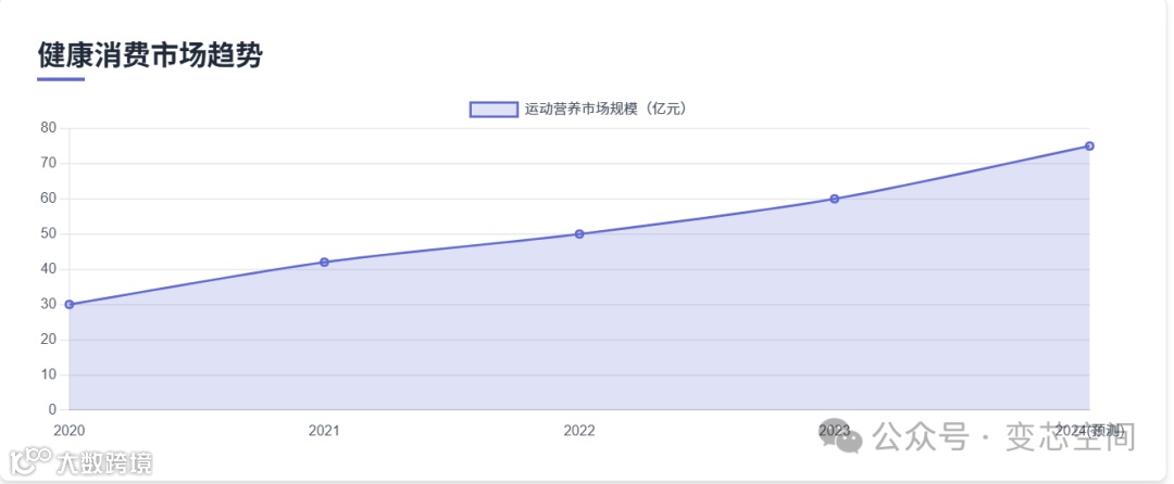 中国"健康中国"战略及老龄化社会趋势推动了大健康产业发展。运动营养食品市场虽起步较晚,但政策扶持(如行业标准完善)和消费者意识提升(如蛋白补充需求)使其潜力巨大。