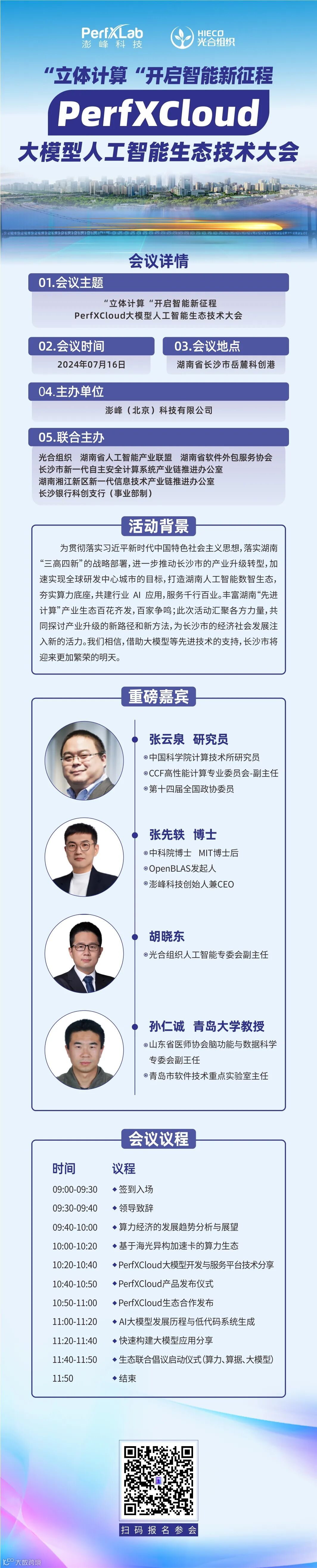 导读:7月16日9:30,在长沙岳麓科创港,“立体计算”开启智能新征程 PerfXCloud大模型人工智能创新技术大会盛大召开,届时不见不散!