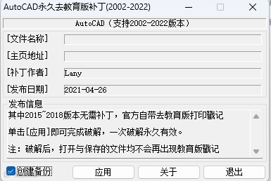 用过AutoCAD教育版的朋友都懂,无论是打开保存文件,还是打印输出后,文档上总会出现“由Autodesk教育版产品制作”的标记,既影响作品专业性,又让人心里膈应。而这款破解补丁就能精准攻克这个问题,一键操作点应用即可彻底去除戳记,还原作品干净质感,再也不用为多余标记发愁。