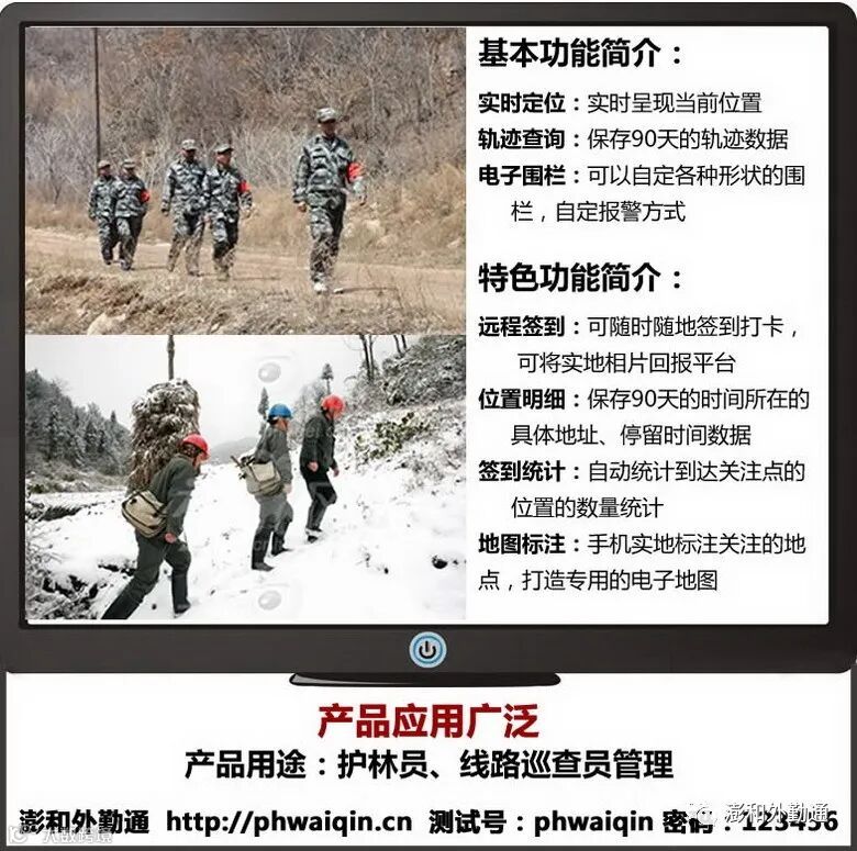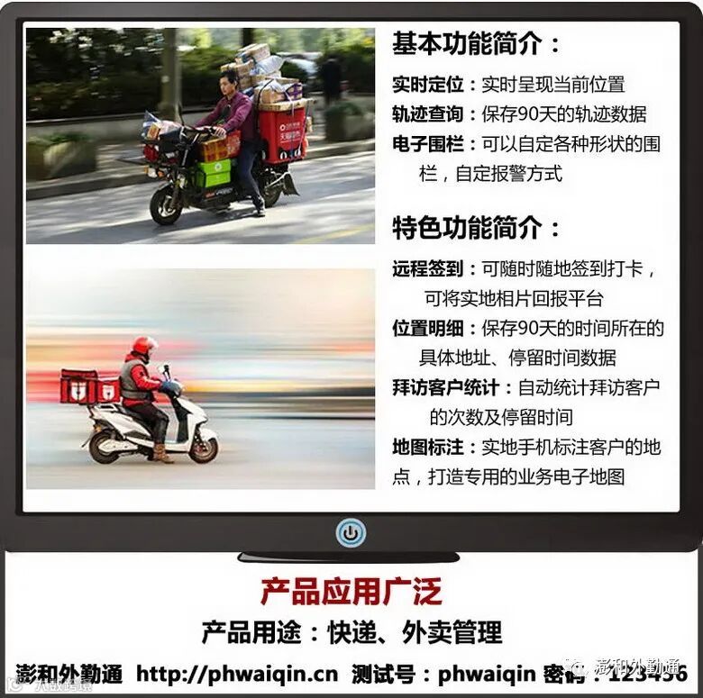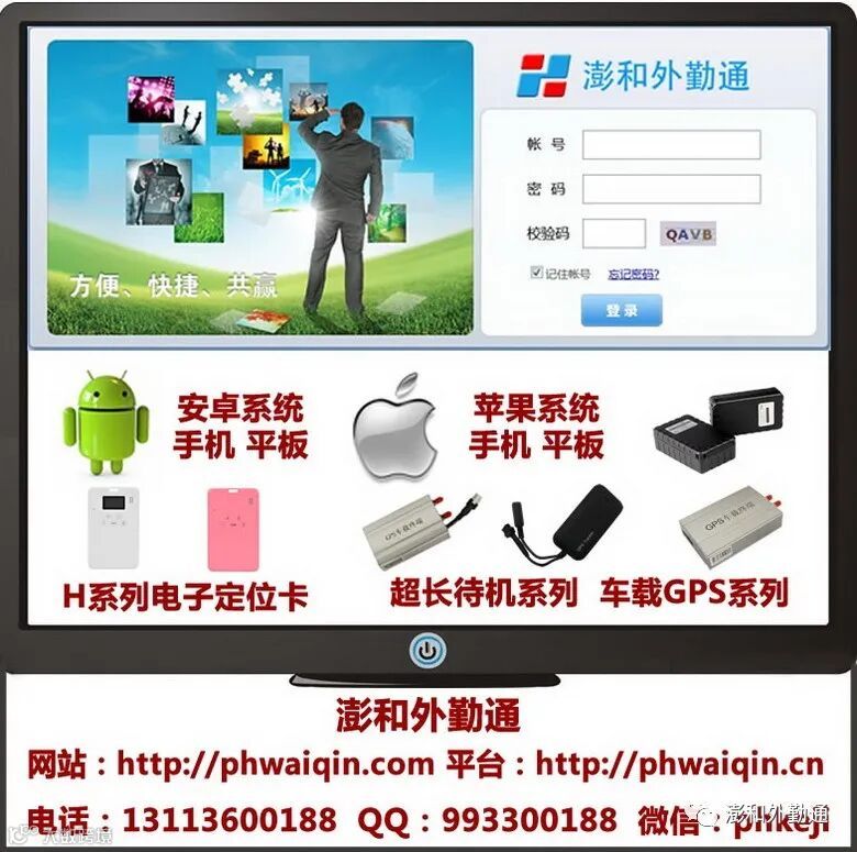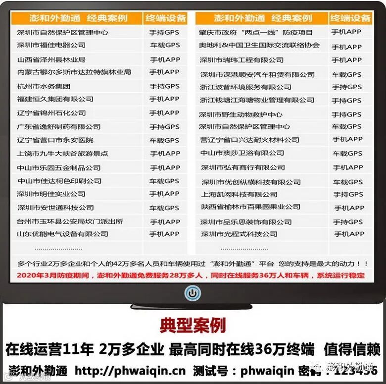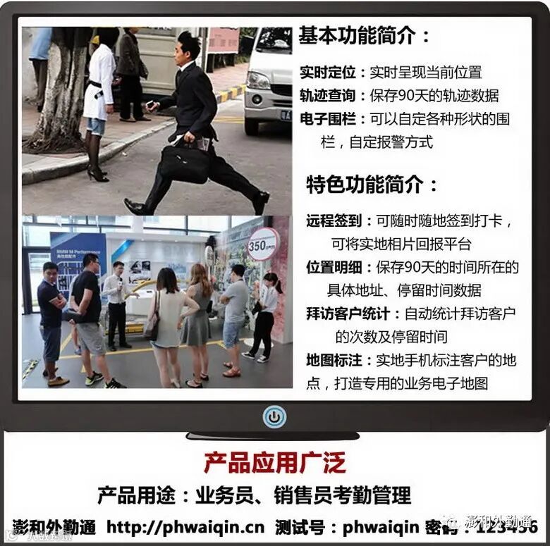 澎和外勤通是一种运用于安卓、苹果智能手机(平板电脑)、车载GPS机、移动GPS机等设备上的专用软件,提供实时位置、活动轨迹、电子围栏、安全保障、考勤管理等服务。