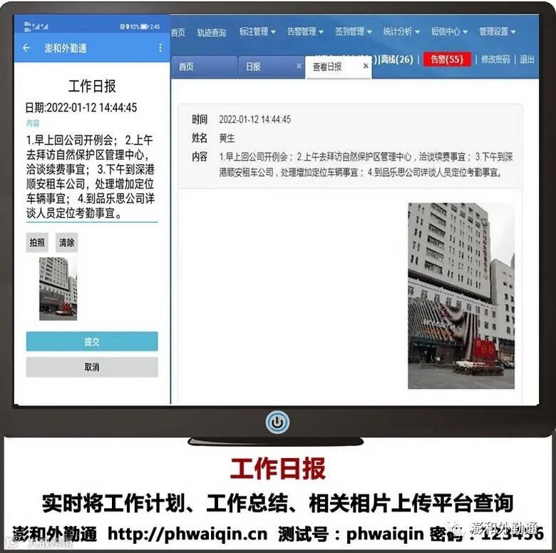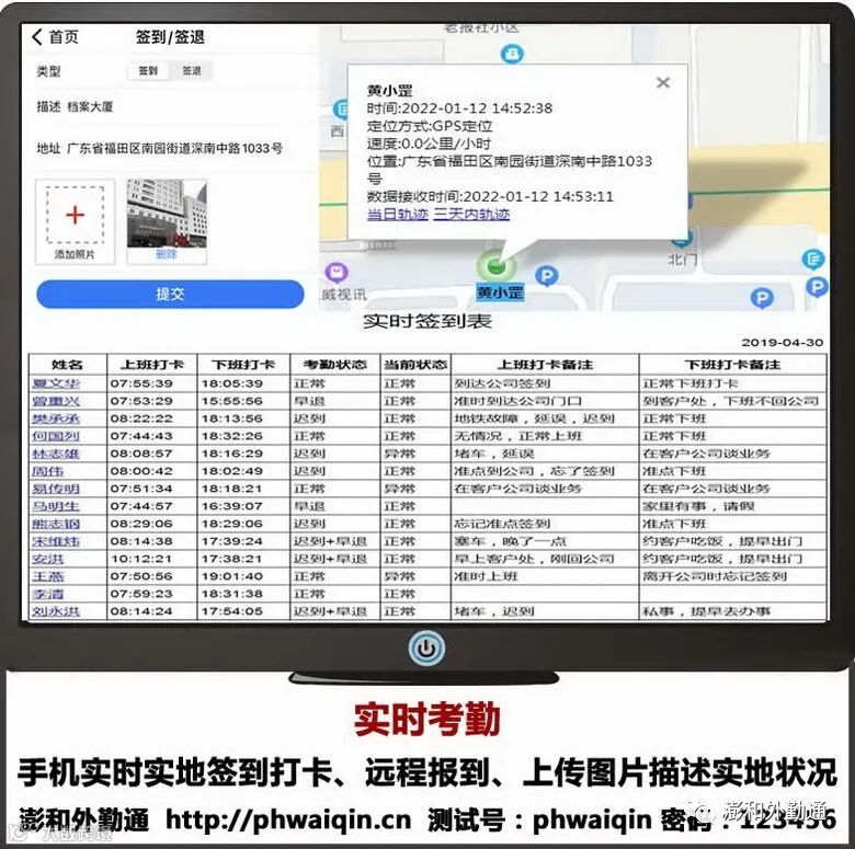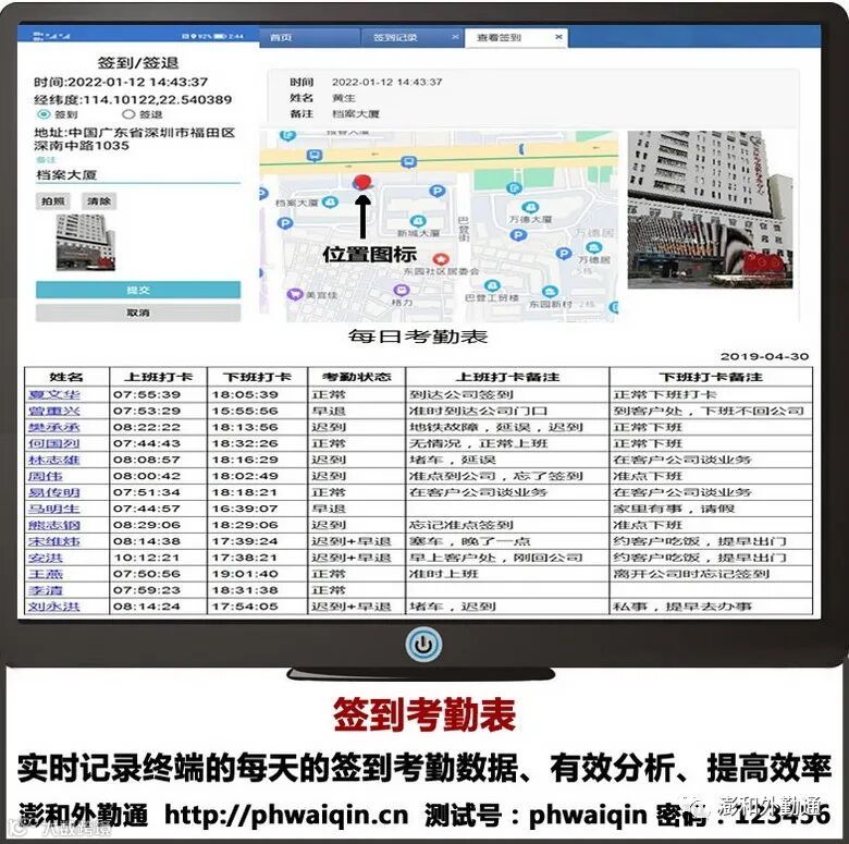 远程签到:可根据实际需要进行手机的远程签到打卡,随时上报位置及照片信息。