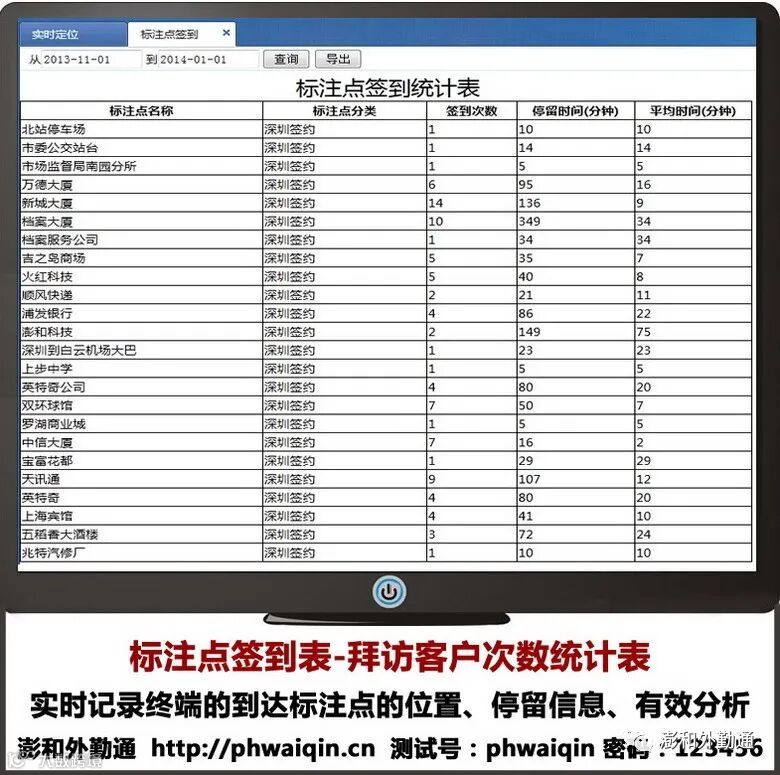 标注签到:自动生成标注点签到报表、对手机或车辆等终端机在关注位置点的签到数量。