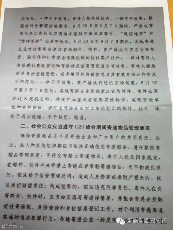 浙江区域内的快递公司仍然和以往一样,正常运行。但确实在G20峰会期间,对邮件、快件的收寄、投递会更加严格,包括用户寄件必须出示有效身份证件、接受开包检查等。