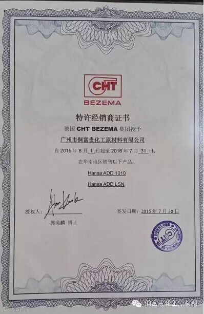 特大喜讯:热烈祝贺我司成功拿到CHT国际化工品牌华南地区特许经销商授权书。