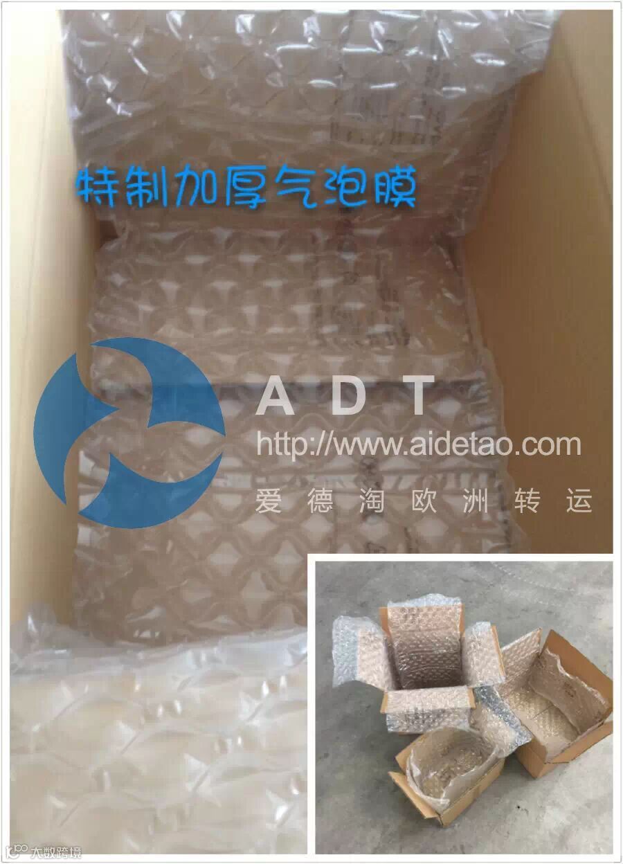 爱德淘为德国唯一使用特制专业加厚气泡膜包装的转运公司,全部采用内箱+外箱+气泡膜+防水膜的打包方式。外箱为加厚加硬的五层瓦楞纸箱。