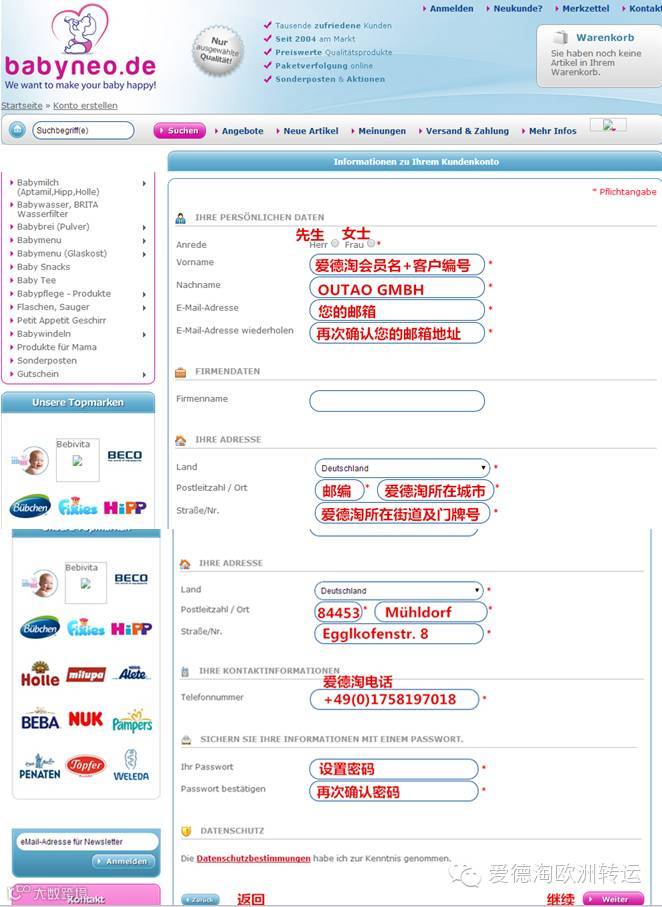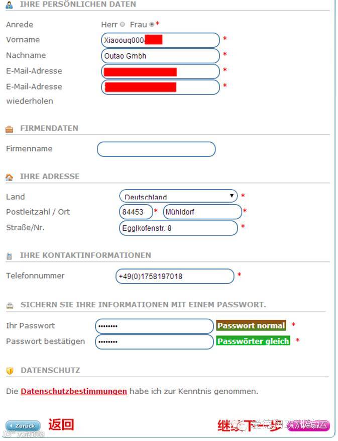 3 填写注册信息,带 * 为必填内容,完成后点击Weiter继续: