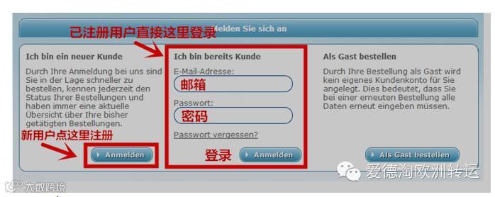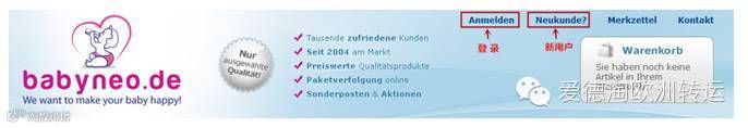 1 打开Babyneo首页,www.babyneo.de 点击Anmelden登录,新用户点击Neukunde注册:
