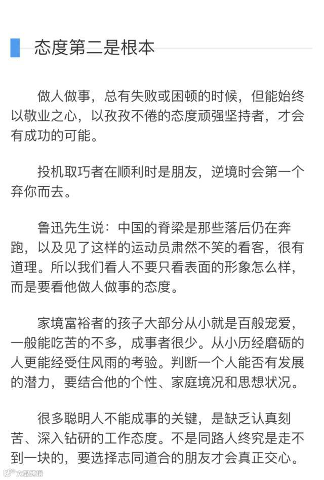 人不可能是全能型的,在合作中始终要把人品和态度放在更重要的位置。“以德为先”,“德才兼备”不仅是选用人才的标准,也是选择朋友或者合作伙伴的标准,选择同行者或是同路人,我们要坚持自己的标准。